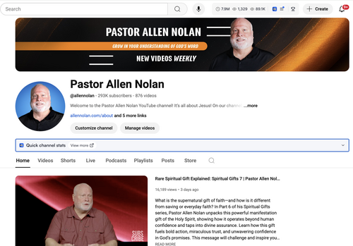 Launched in 2018, Pastor Allen Nolan's YouTube Channel now reaches hundreds of thousands of people all over the world every month, and has accumulated over 60 million views and 290,000 subscribers. Brady Shearer from ProChurchTools.com named Cornerstone Fellowship with Pastor Allen Nolan the "fastest growing church on YouTube" in 2023 (watch Brady's interview about Pastor Allen's channel video here). Tune in live with hundreds from around the world every Sunday for a livestream of Allen's sermons at 10:00am CST.